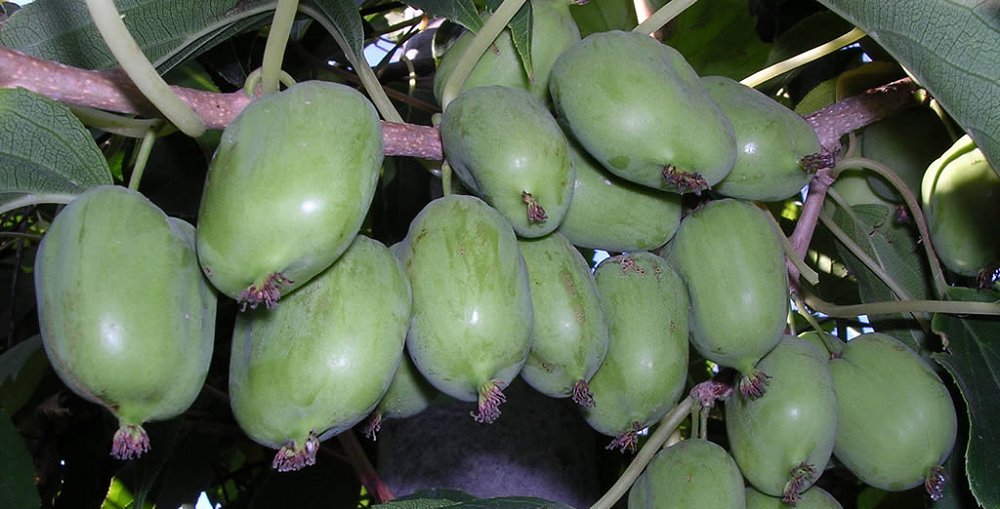 Характеристики плода: ягода до 19 г, плодовые растения с вкусными, нежными, ароматными плодами, по внешнему виду похожи на киви, зеленого цвета по вкусу – киви и сладкий крыжовник