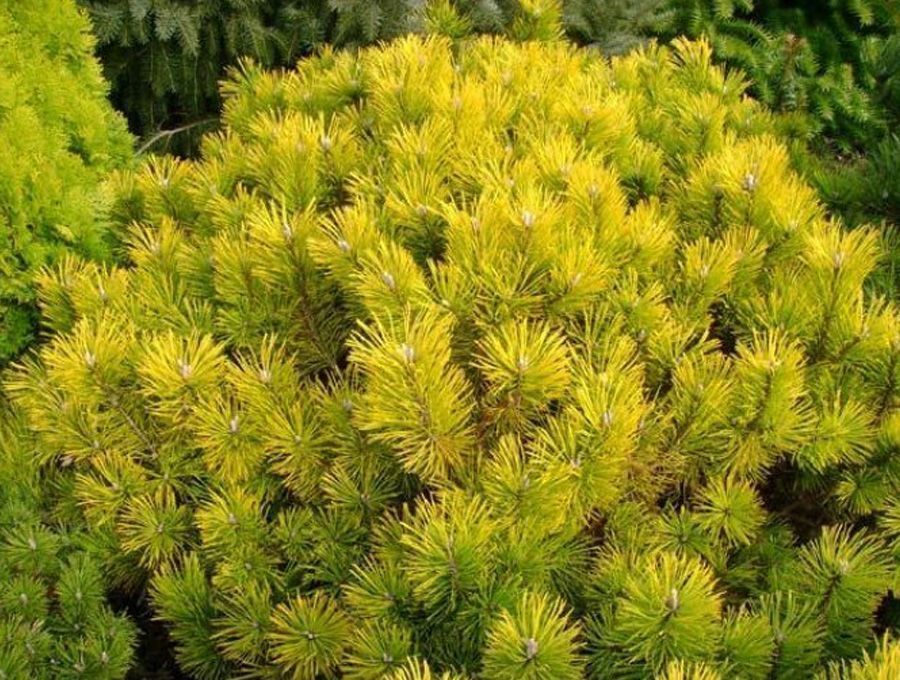 Сосна горная Голден Глоу. Название этой сосны в переводе с английского означает «Золотое сияние». Необычное растение, хвоя которого приобретает желтый цвет с осени по весну. Как и все горные сосны, хорошо разрастается в ширину. Корни сосны не мешают другим растениям, поэтому в саду можно компоновать с чем угодно. Для усиления густоты куста и сдерживания роста в высоту можно прищипывать молодые побеги весной.