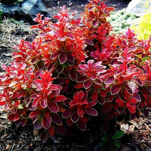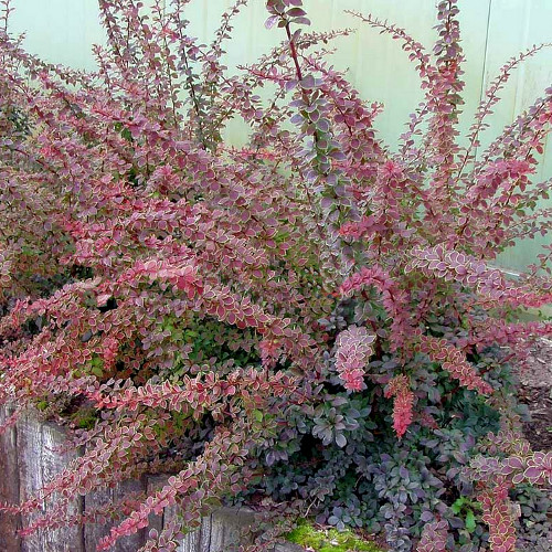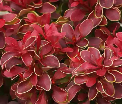 Листья яркие, относительно крупные, с заострённым краем, пурпурно-красные с тонкой жёлто-зелёной или жёлтой каймой, на более взрослых побегах с розовыми крупными колючками; осенью становятся тёмными, почти фиолетовыми. Для поддержания красивой кроны рекомендуются регулярные стрижки.