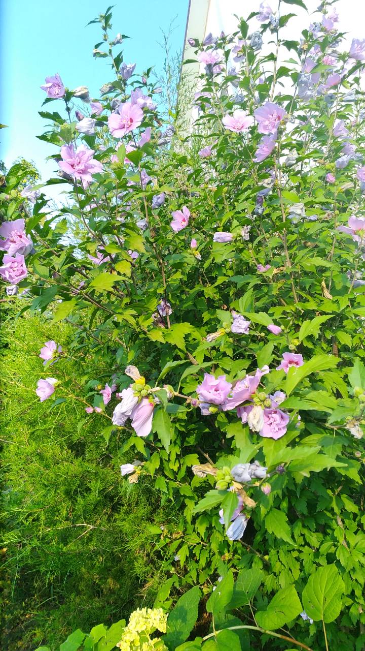 Куст высотой до 3,0 м. Цветет обильно и продолжительно с июня по октябрь анемоновидними лилово-розовыми с махровой серединкой цветками диаметром 10 см.