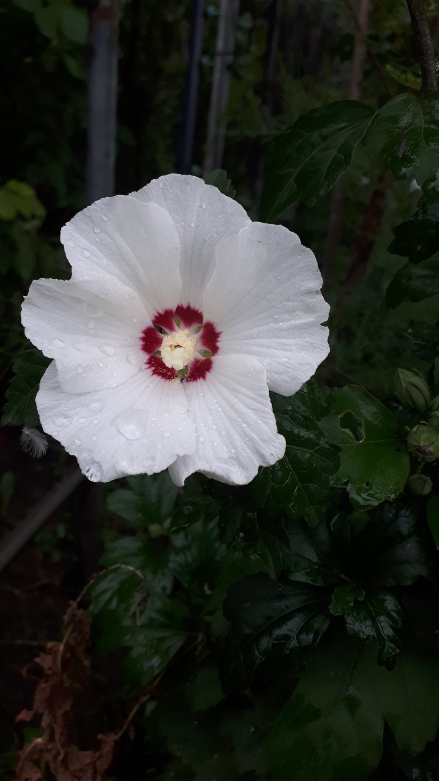 Прямой, медленно растущий кустарник, достигающий 1,5-2 м в высоту. Листья опадающие, весной появляются поздно, осенью желтые. У него равномерная густая крона и крупные белые цветки. Их центральная часть окрашена в красный цвет. Цветы декоративные, до 10 см в диаметре, белые, с крупной красной серединкой, одиночные, похожи на цветки мальвы (июль - сентябрь). Требует перегнойной, проницаемой почвы.