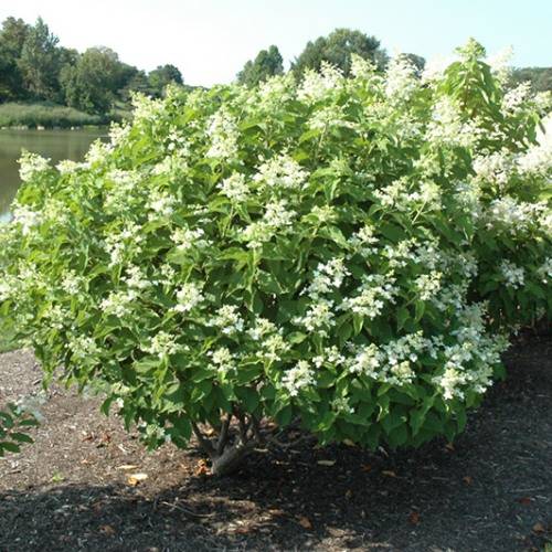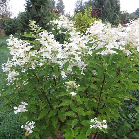 Гортензия метельчатая Меджикал Старлайт - куст высотой 150 - 175 см, молодые побеги красные, цветёт обильно в июле-сентябре, краевые цветки чисто-белые, расположены в соцветиях неравномерно.