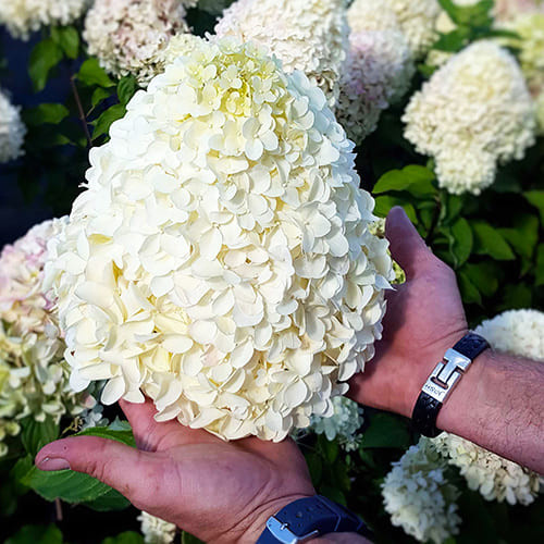 Мощная гортензия до 170 см высотой, сильные прямые побеги формируют широкую крону до 170 см в диаметре с очень крупными цветками. В начале цветения окраска светло-зеленая, похожа на цвет лайма, со временем цвет меняется на белоснежный, в финальной стадии приобретает розовый оттенок.