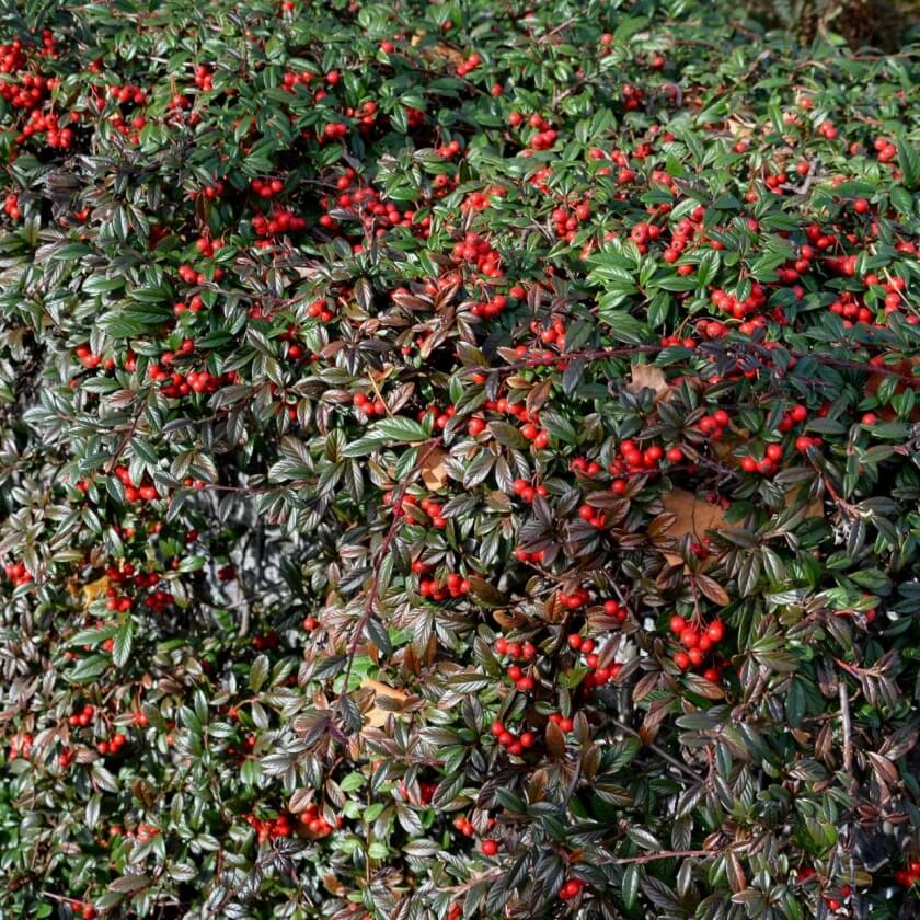 В мае-июне кизильник цветет мелкими белыми цветками, обильно укрывающими побеги. Осенью на их месте появляются ярко-красные ягоды, которые хранятся до зимы и добавляют цвет даже в холодный сезон. Осенью листья приобретают бронзово-красноватый оттенок, что делает растение особенно эффектным.