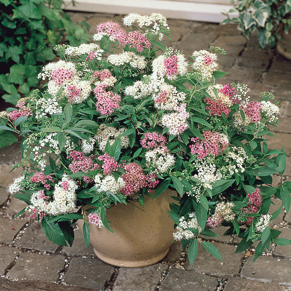 Отличается крайне необычным трехцветным цветением. Цветки белого, розового и красного цвета одновременно присутствуют в каждом соцветии-щитке. Красивоцветущий низкорослый кустарник 0,6-0,8м.