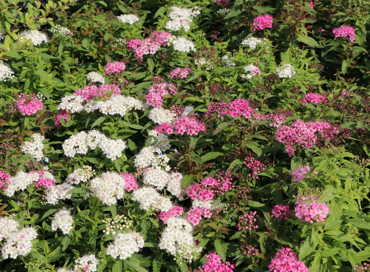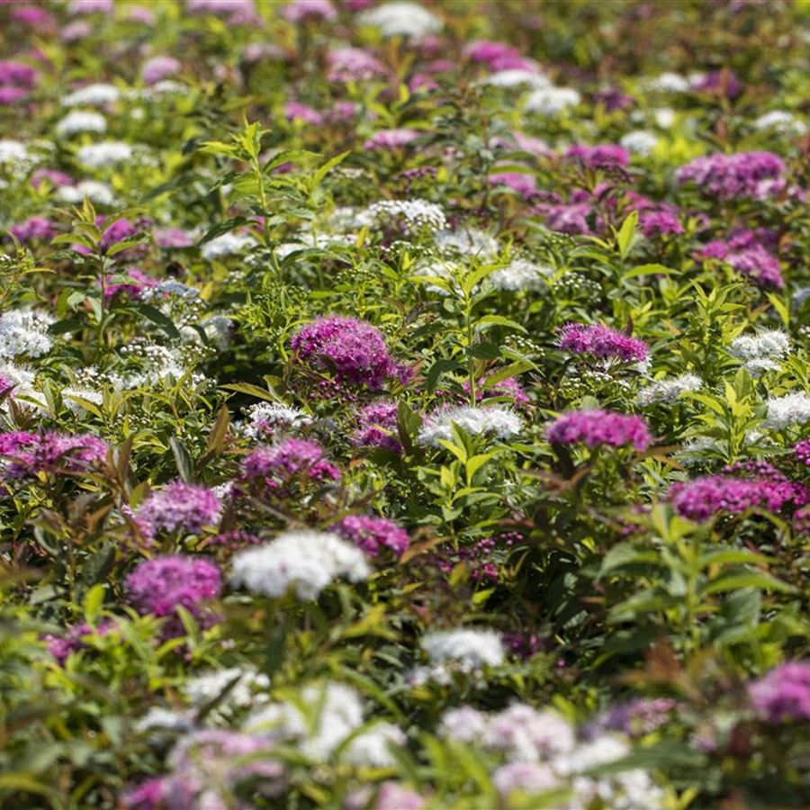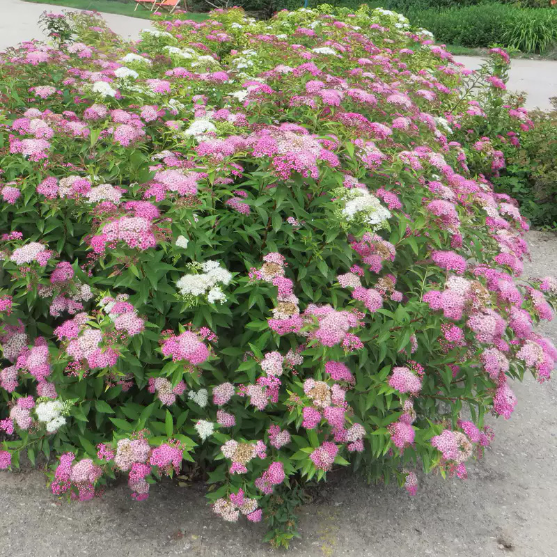 Один из самых красивых сортов японской спиреи с компактной, плотной, округлой формой. Годовой прирост до 15 см. Маленькие цветки, примерно 5 мм, собраны в плоские соцветия, принимают окраску в зависимости от стадии развития, от белого до розового. Они появляются на побегах в конце июня и июле.