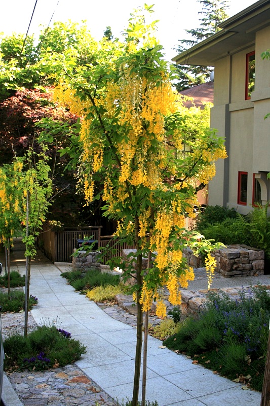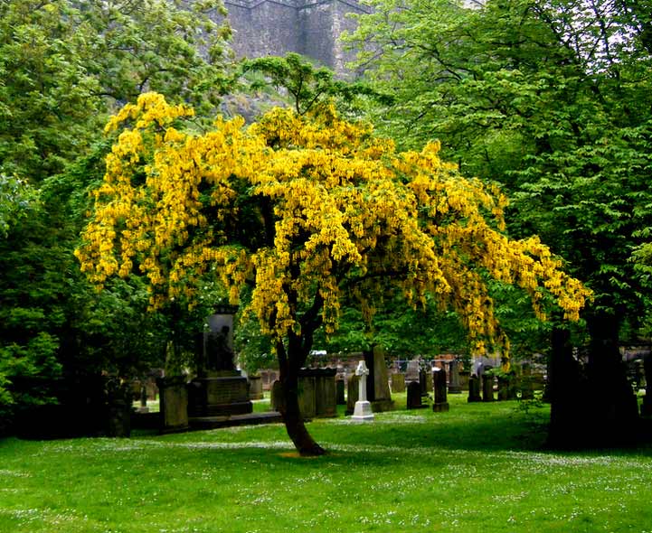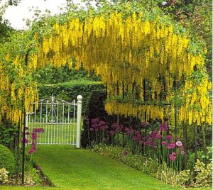 Надо просто купить саженцы бобовника альпийского, который может быть листопадным деревом или кустарником, обладающим широкой раскидистой кроной. Другое его название золотой дождь альпийский говорит само за себя!