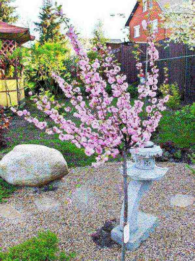 Миндаль декоративный — кустарник, достигающий высоты до 2-3 метров.