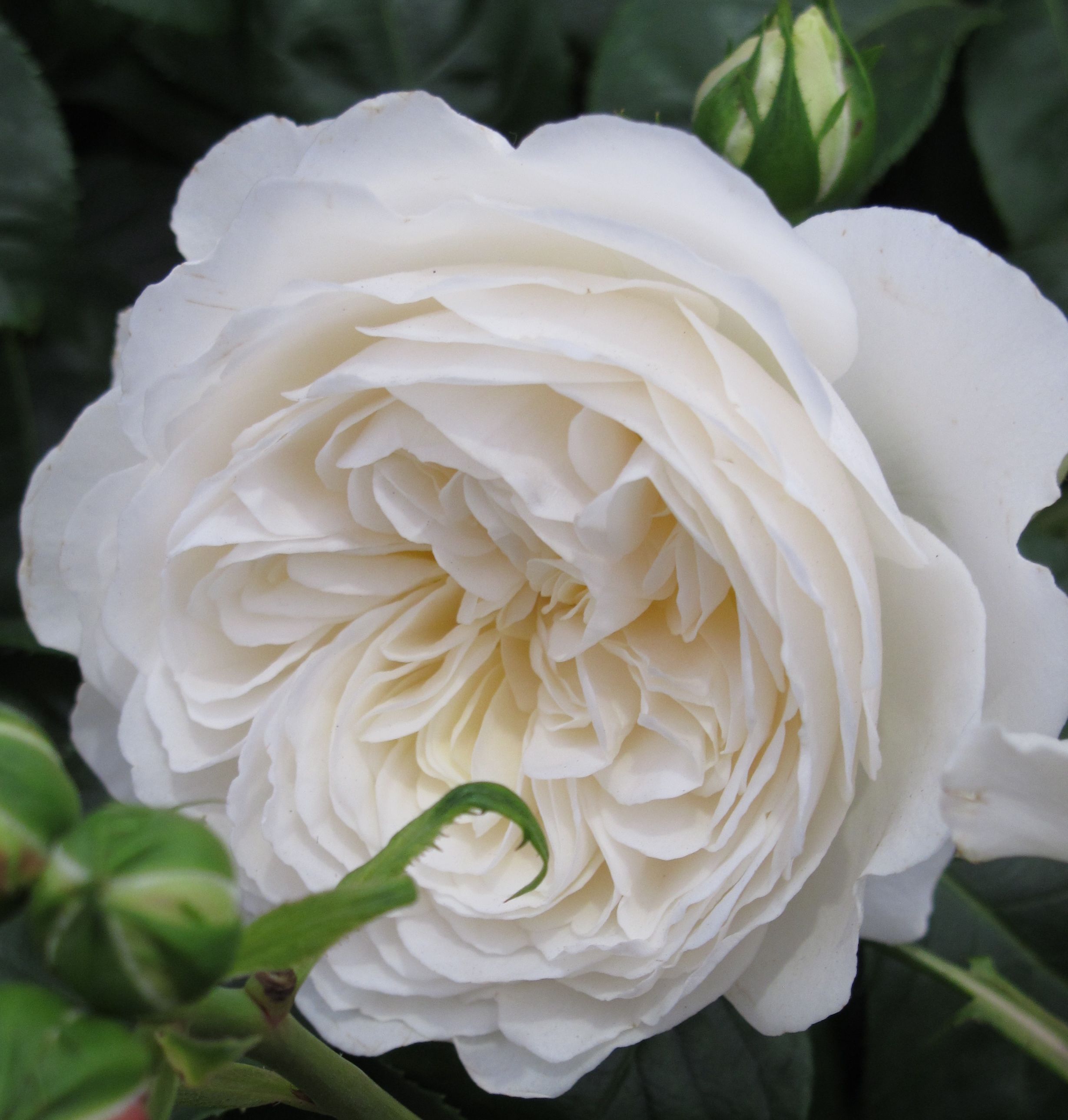Цветки White English крупные, густомахровые, чашевидной или розетковидной формы, диаметром 8-10 см. Лепестки нежно-белые, иногда с легким кремовым или розовым оттенком в центре, что придает цветку особый шарм. Аромат средней интенсивности с нотами фруктов, мускуса и классических роз. Цветки собраны в соцветия по несколько штук, идеально подходят для среза.