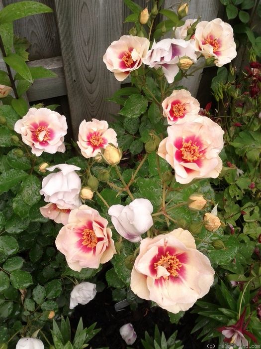 Цветок диаметром 6-8 см с умеренным ароматом сладкой пряности сохраняет свой привлекательный вид в крупных кластерах весь период цветения вплоть до полного отцветания . В отличие от своего невысокого родителя - сорта Blue for You, от которого получено это прекрасное пятно, Bull s Eye сильнорослый, густо облиственный куст с серозелеными листьями высотой от 120 до 170 см. и выше, особенно в теплом климате, что может потребовать некоторой обрезки для сохранения формы куста.
