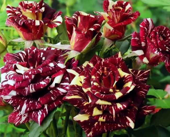 Расцветка сорта Фокус-Покус является уникальной, цветки имеют темно-бордовый окрас, с желтыми вкрапления, иногда пятнышками. На кустах этого сорта найти одинаковые цветы невозможно, потому что никакой закономерности в желтых вкраплениях нет, и, к тому же, на одном цветоносе даже может быть чисто темно-бордовая роза и чисто желтая.