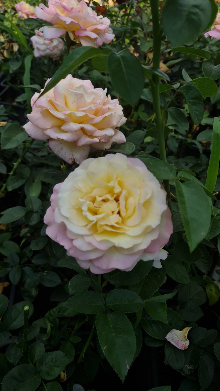 Куст сорта Глория Дей вырастает до 120 см . Имеет насыщенно зеленые, кожистые, крупные, блестящие листья. Количество шипов на кусте небольшое.