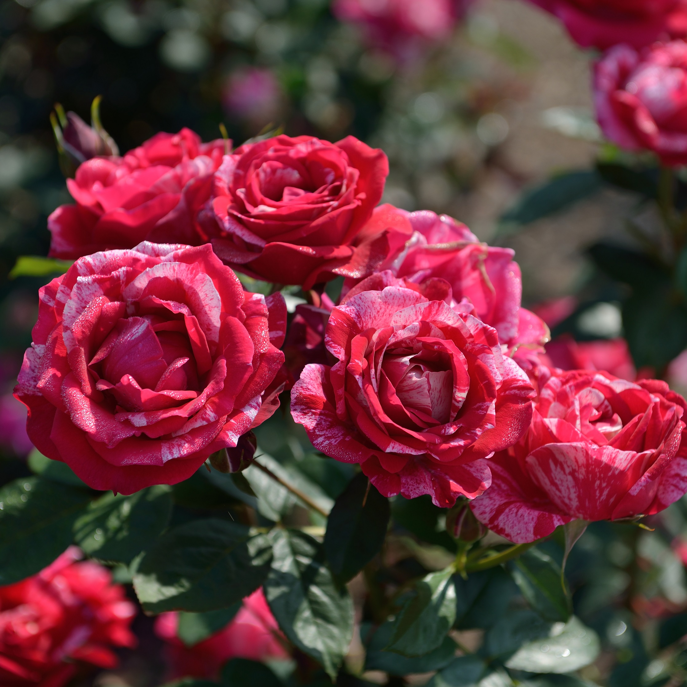 Куст прямостоячий, крепкий, среднерослый — высотой до 100–120 см и шириной до 80 см. Листья темно-зеленые, глянцевые, плотные, с хорошей устойчивостью к болезням. Henri Matisse идеально подходит для клумбы, миксбордеров, бордюров и контейнерного выращивания. Благодаря необычному окрасу, эта роза прекрасно сочетается с однотонными сортами, создавая яркие акценты в саду.