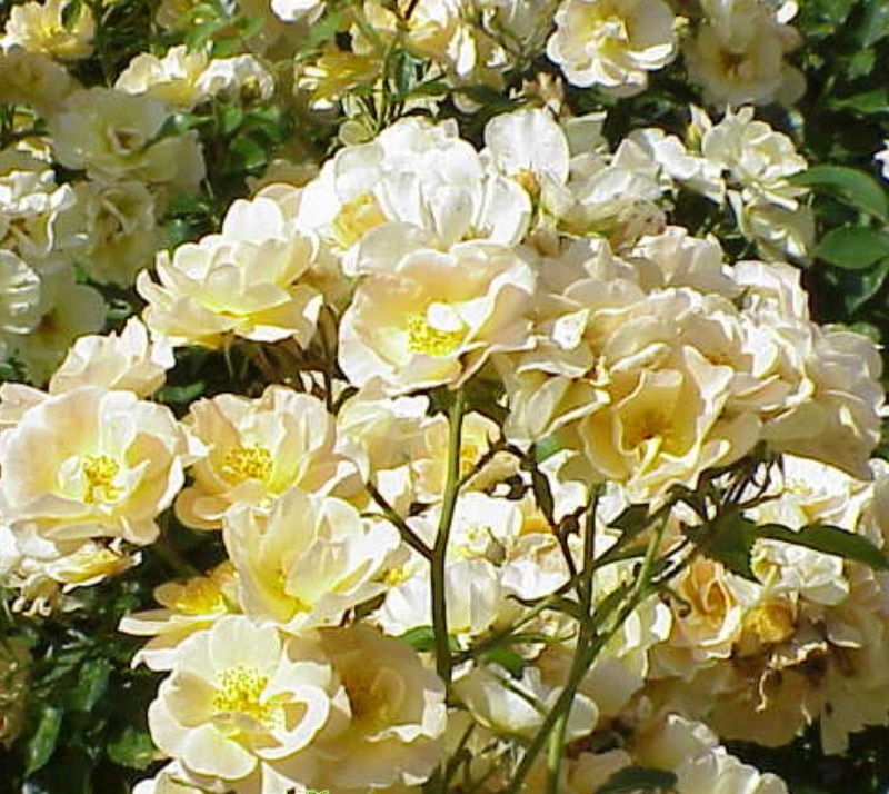 Цветки Парад желтая густомахровые, имеют насыщенный желтый окрас, в диаметре достигают 5-7 см, собраны в кисти по 7-15 штук. Кусты среднего размера, листва на них глянцевая, она станет прекрасным фоном для этих красивых цветочков. Наш частный питомник садовых растений советует вам купить саженцы этих роз, потому что за ними очень приятно ухаживать, в связи с тем, что они практически не имеют колючек.