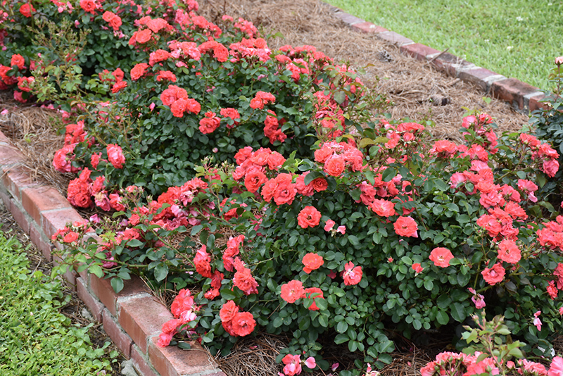 Цветет обильно и длительно до заморозков крупными яркими кораллово-розово-красного оттенка цветами собранными в пышные соцветия. Цвет лепестков переливается лососево-розово-оранжевыми оттенками; форма цветка чашевидная. Куст компактный, высотой до 40 см и шириной 60 см, округлой формы.