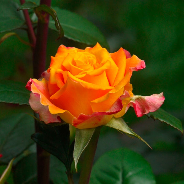 Листья темно-зеленой окраски, кожистые, имеют приятную глянцевую поверхность. Они обильно покрывают куст розы и создают красивый фон. Побеги прямостоячие, с незначительным количеством шипов.