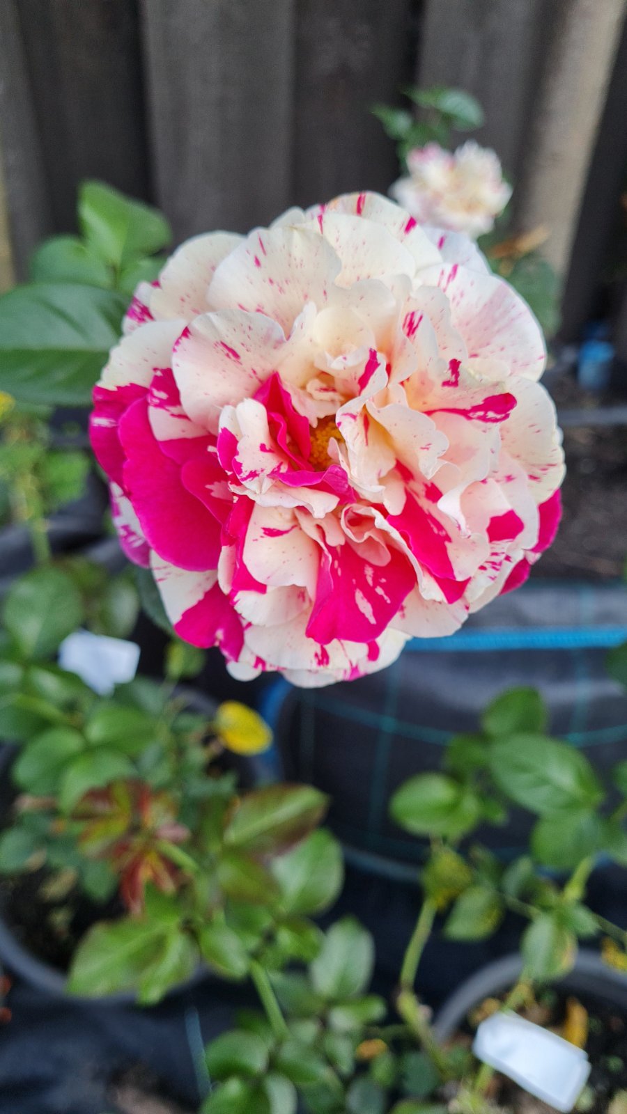 Двухцветная, повторноцветущая роза. Лепестки пестрые, кремовая основа и малиновые штрихи. Высота куста до 3х метров.