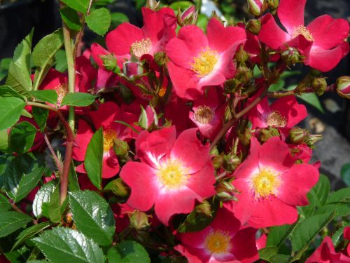 Большие, элегантные кисти маленьких, одиночных, слегка ароматных, ярко-темно-розовых цветков с светлым центром, глянцевой листвой на раскидистом кусте. Красивая и непрерывно цветущая кустовая роза, которая поздней осенью образует большие кисти с оранжево-красными плодами шиповника.