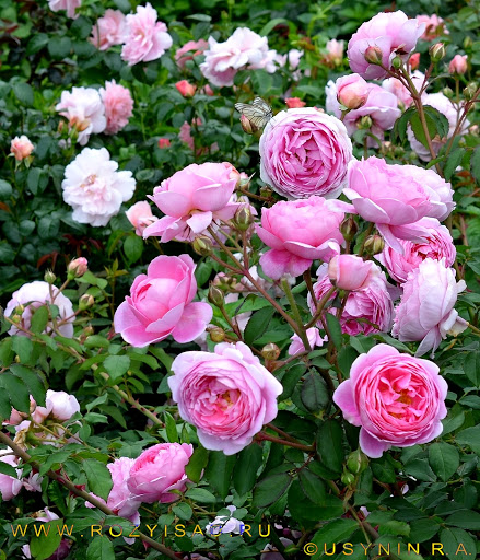 Эта роза Остина относится к парковым сортам. Куст достаточно высок — до 1,5 м, а его ширина 90 см. Его выгодно высаживать его у стен и заборов, при сильной обрезке подойдет и для переднего плана. Форма куста округлая, ветки приобретают форму дуг под тяжестью крупных (от 12 до 14 см) махровых цветков, напоминающих пион. Цвет лепестков насыщенно розовый, холодного оттенка. Лепестки слегка загнуты к центру чаши цветка, интенсивность цвета усиливается к центру. Наружные ветви куста сгибаются почти до земли, а внутренние удерживают более крупные розы в вертикальном положении. Отличие куста этого сорта в том, что бутоны смотрят вверх, а распустившиеся розы склоняются к земле. Это придает кусту вид каскада, равномерно со всех сторон украшенного розами. При первом цветении куст изобилует цветками, но они не слишком большого размера. При втором цветении роз меньше, но они крупные. Цветы источают нежнейший аромат розового масла, сладкого яблока и цитруса.