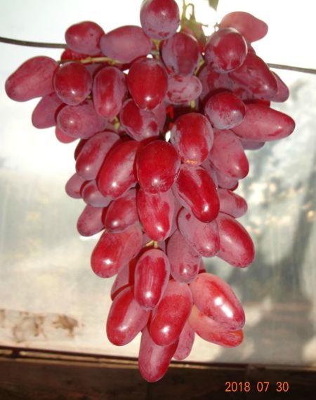 Ягоди овально подовжені, яскраво-червоні, масою до 18-20гр, до 4,5см в довжину. М'якуш щільний, хрусткий, смак з легким мускатом. Родючість пагонів висока, кущі урожайні. Стійкість до хвороб і морозу у стадії вивчення.