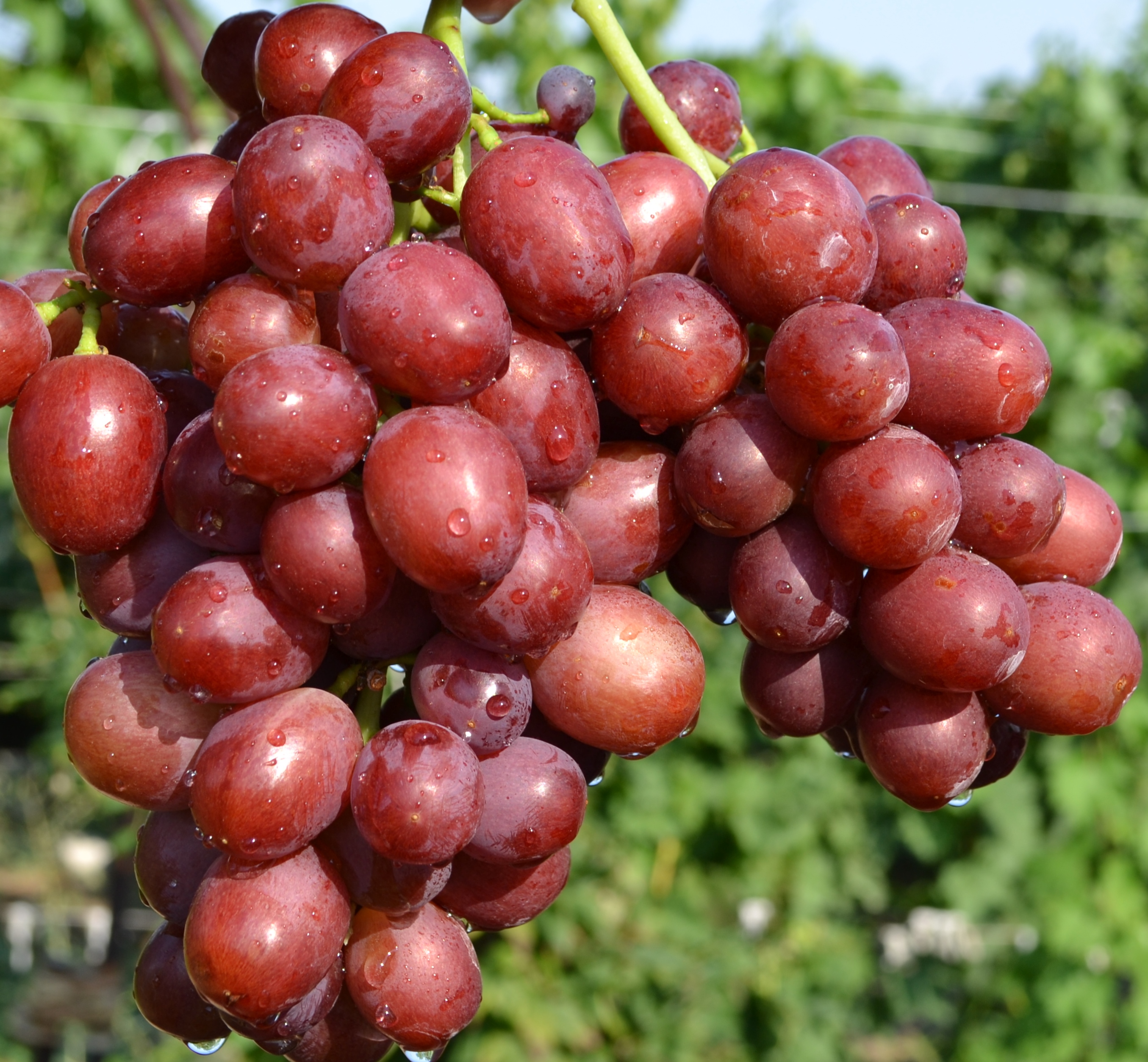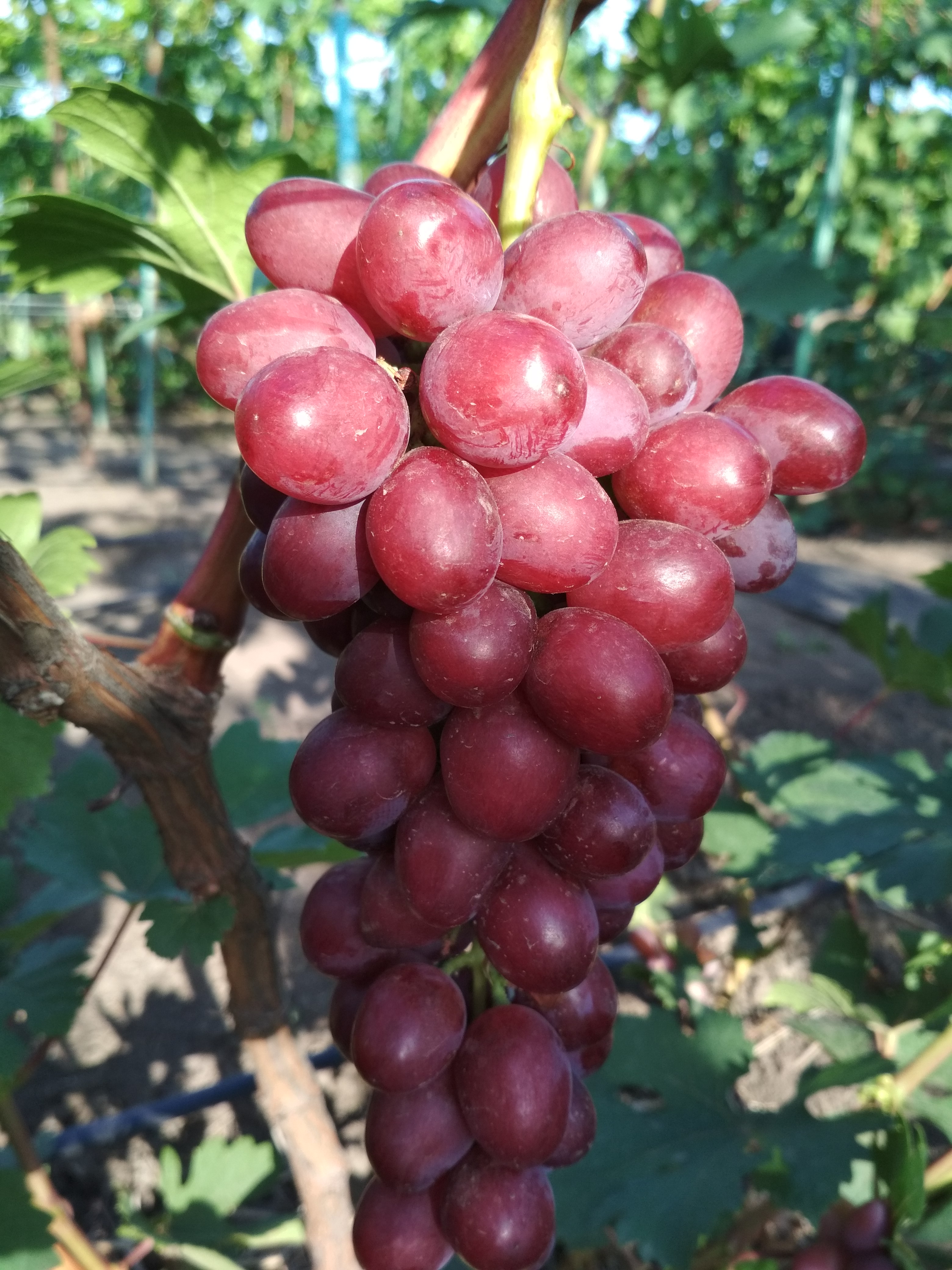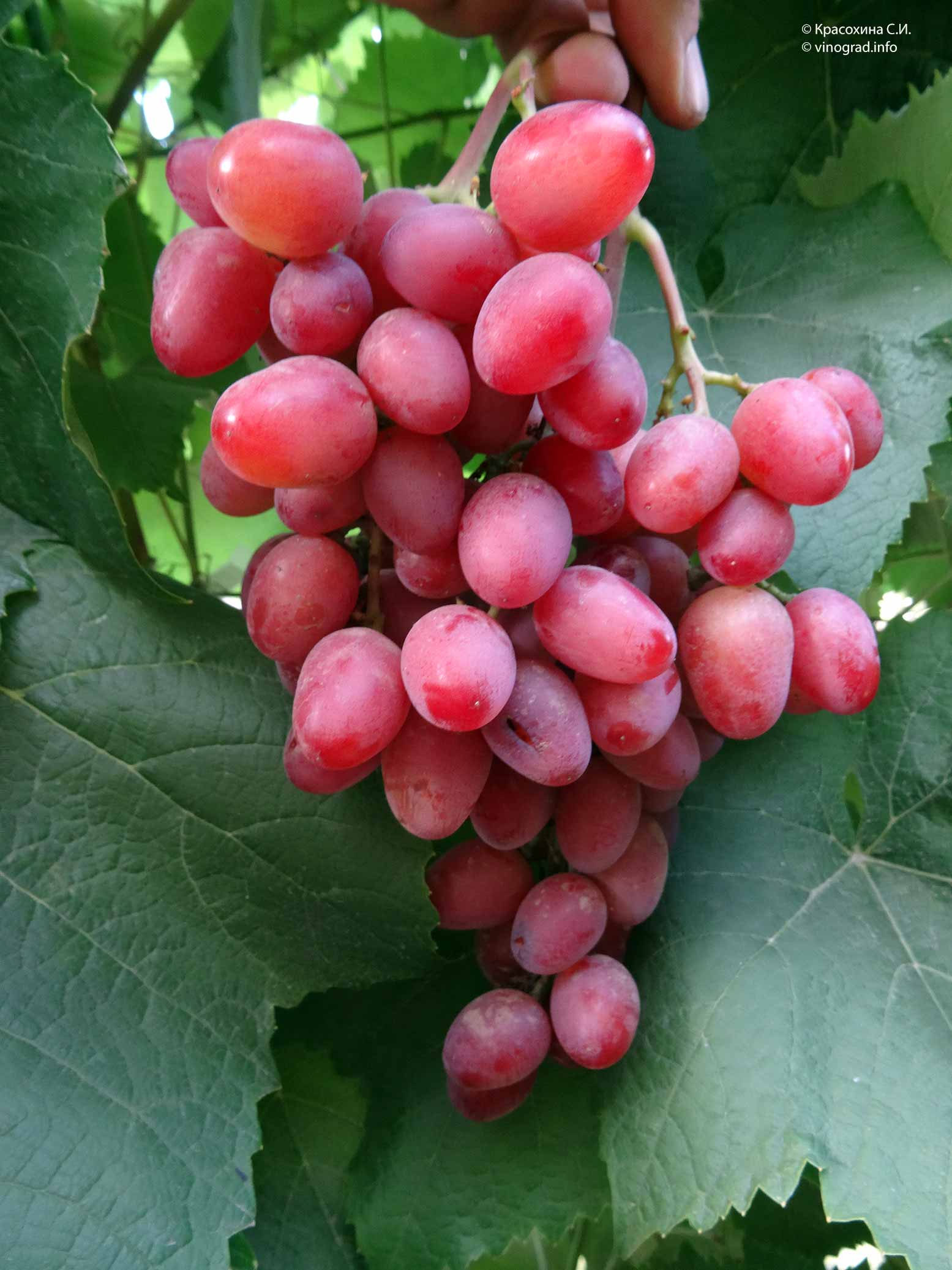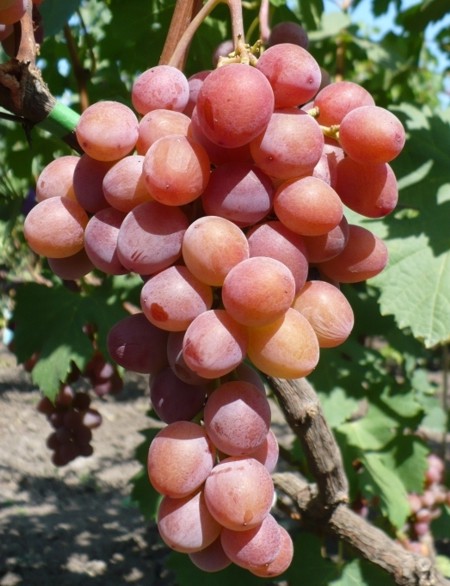 Довжина виноградного грона досягає 40см. Зразкова вага кисті 0,8 кг, але при хорошому догляді доходить до 1 кг ягід середнього розміру, приблизно 2,6 х 2.4см. Маса однієї ягоди складає 3-4гр. Мають овальну, злегка подовжену форму. Колір дозрілого плоду рожево-червоний, відтінок залежить від регіону вирощування.