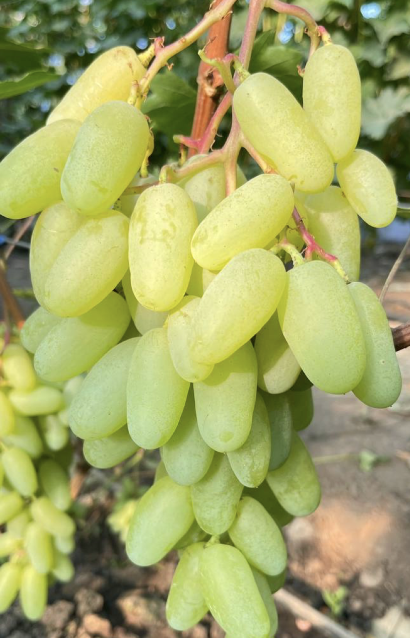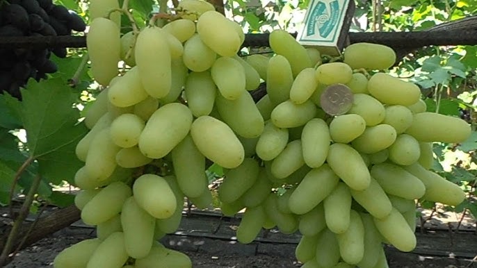 Ягоди пальцеподібні, жовті, на сонці можуть злегка засмагати. Смак гармонійний. На початку дозрівання відчутний легкий мускат, але при накопиченні цукру він зникає. М’якоть щільна, м’ясиста, хрумка. Шкірочка тоненька, не відчувається при їжі. Насінин дуже мало (2-3). Довжина ягід – 4,5-5 сантиметрів, маса – 16-18 грам.