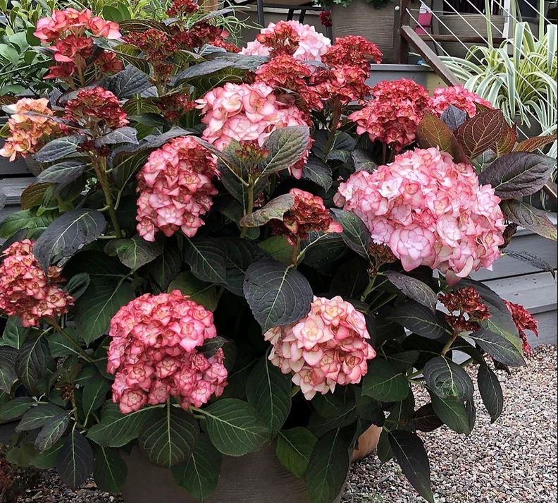 Гортензія крупнолиста Міс Саорі – це вишуканий сорт із махровими біло-рожевими квітами, які формують щільні суцвіття. Вона чудово підходить для вирощування в саду та контейнерах. Гортензія цього сорту відзначається рясним і тривалим цвітінням, а її листя набуває пурпурного відтінку восени, що додає декоративності.