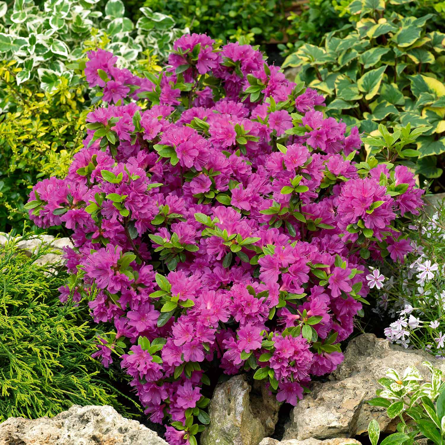 Максимальна висота/ширина: 0,6 м/1м. Один з найпоширеніших і найкрасивіших рясно-квітучих рододендронів із сімейства азалія японська. Квітки численні, червонувато-фіолетові, діаметром 2,5 см, лійкоподібні зібрані у великі суцвіття, які густим килимом вкривають рослину. Цвітіння рясне, з травня до червня.