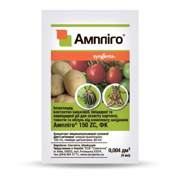 Інсектицид Ампліго 150 ZC ф.к. 4 мл - новий якісний інсектицид контактно-кишкової дії з двома діючими речовинами 100 г/л хлорантраніліпролу 50 г/л лямбда-цигалотрину. Діючі речовини мають принципово різні механізми роботи: одинблокує центральну нервову систему шкідника, інший - роботи м’язів шкідника. Завдяки цьому Ампліго маєширокий спект дії і має потужну стартову дію (нокдаун-ефект) на шкідника та високу ефективність протягом усього періоду дії препарату.