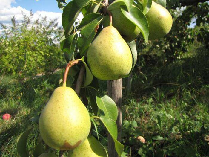 Плоди середньою масою 110 г, грушоподібні, гладкі, одновимірні, правильної форми. Шкірка середня, суха. Основне забарвлення в період знімної зрілості зелена, покривна у вигляді бурого рум'янцю на половині поверхні плода. У період споживчої зрілості основне забарвлення зеленувато-жовте, покривне у вигляді буро-червоного рум'янцю з білуватими крапками. Плодоніжка середня, пряма, косопоставлена. Вирва вузька з бугристими краями. Чашка закрита. Блюдце дрібне, широке. Серце верхнє, ромбоподібне. Насіннєві камери середні. Насіння добре виконане, ширококонічне, коричневе.