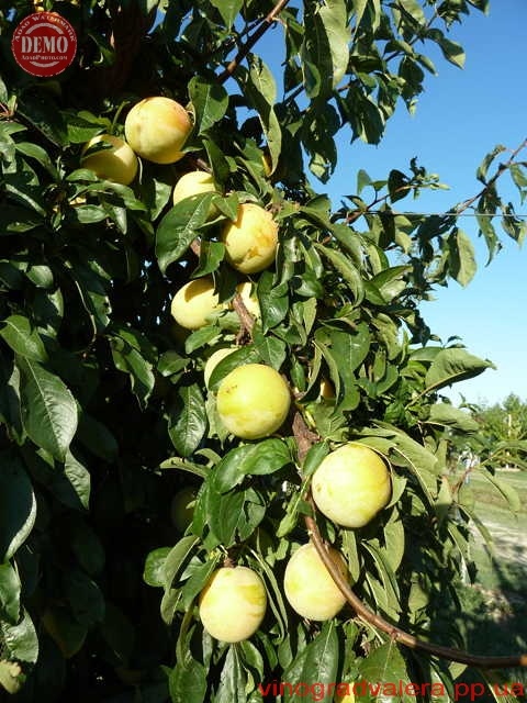 Плоди великі, масою 50-60 г, окремі до 100 г, округло-овальні, жовті, з невеликим рум'янцем рожевого кольору або без нього, покриті сизим пруіновим нальотом. М'якуш жовтий, щільний, ароматний, відмінних смакових якостей з великим вмістом цукру. Плоди високотоварні і транспортабельні, після знімання досить тривалий час зберігаються. Сорт комерційного напряму.