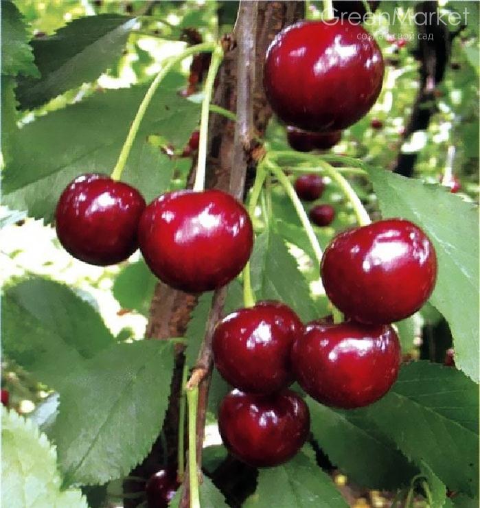 Плоди великі, 18 х 19 х 17 мм, масою до 5 г, темно-червоні, округлі, злегка стислі у вертикальному напрямі, з характерним плоским черевним швом, округлою верхівкою з вм'ятим маточковим слідом, дрібною і вузькою воронкою і широкою борозенкою уздовж спинного шва. М'якуш темно-червоний, досить щільний, соковитий, кисло-солодкого смаку, сік рубіново-червоний. Кісточка 11 х 9 х 7 мм, овальна або дещо яйцевидна, гладка, масою 0,4 г, складає 8т загальної маси плоду, добре відділяється від м'якуша. Плодоніжка в середньому 31 мм, до плоду прикріплена середньо, відділяється з сухим відривом.