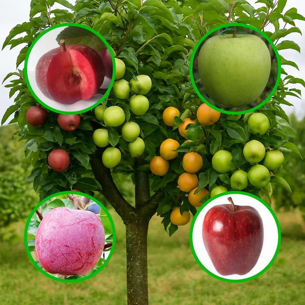 На дереві підщеплені 4 сорти: Яблуня Байя Маріса (ранньо-зимовий, червономякотний), яблуня Муцу (зимова), яблуня Вільямс Прайд (літня), яблуня Ред Чіф (зимова)
