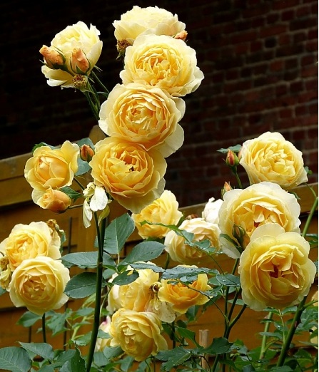 Троянда англійська Грехем Томас (Graham Thomas). Одна з відомих англійських паркових троянд. Квітки махрові, чашовидні, 10см. в діаметрі, яскраво-жовтого кольору, з теплим ароматом чайної троянди. Рясно цвіте раннього літа, потім помірно залишок сезону. Пагони довгі, дугоподібні, листя темно-зелене, блискуче. Кущ сильнорослий, прямостоячий. Любить хороший догляд, часті поливи і підгодівлі, в цьому випадку квітки більші, а цвітіння майже безперервне. Висота куща 150-250см.