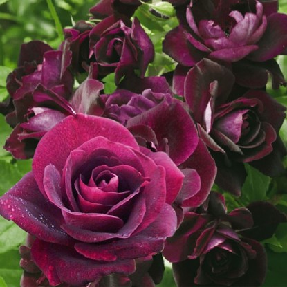 незвичайний колір троянди - густо-сливовий, майже пурпурний, а пелюстки оксамитової текстури, з білим очком в середині. Висота до 1.5м.