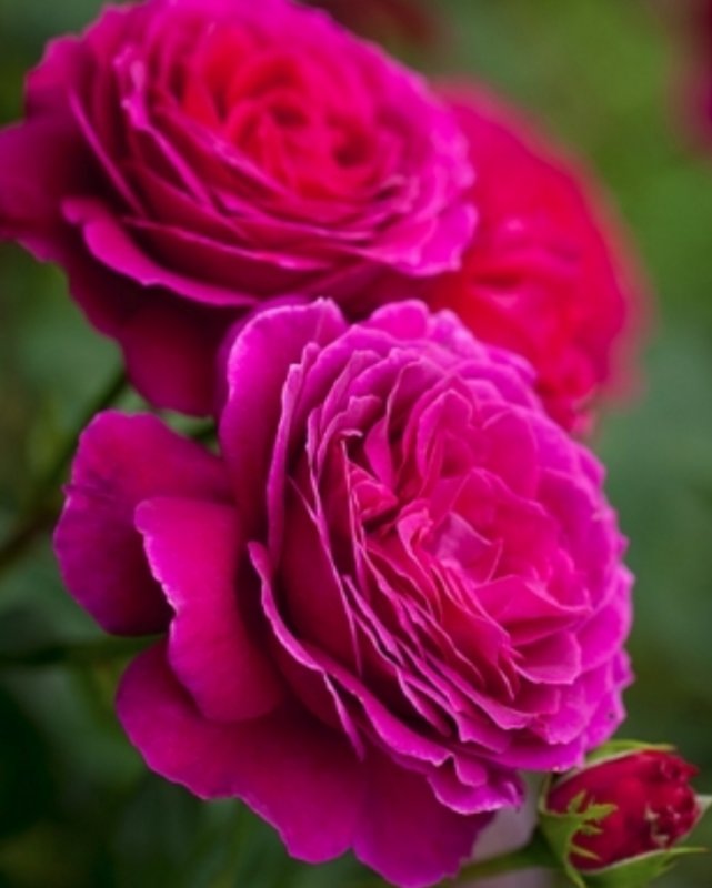 Форма бутонів класична для чайногібридних троянд. Квіти досить великі, пишні, оксамитові, махрові (до 55 пелюсток). Пелюстки оксамитові, хвилясті по краях. Забарвлення пурпурово-малінова. Цвітіння багато, тривале (з перших чисел червня до сильних осінніх холодів). Квітки зазвичай з'являються по одному на дуже довгих пагонах.