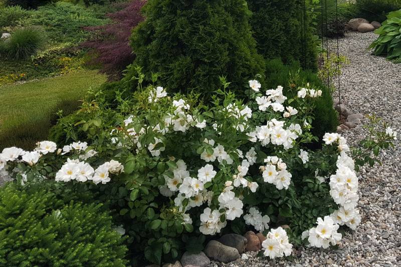 Квітки яскраво-білого кольору як у бутоні, так і повністю розкриті, діаметром близько 8 см, зібрані у великі суцвіття (до 11 шт). Повторне цвітіння у сорту відмінне, таке ж рясне, як і перше.