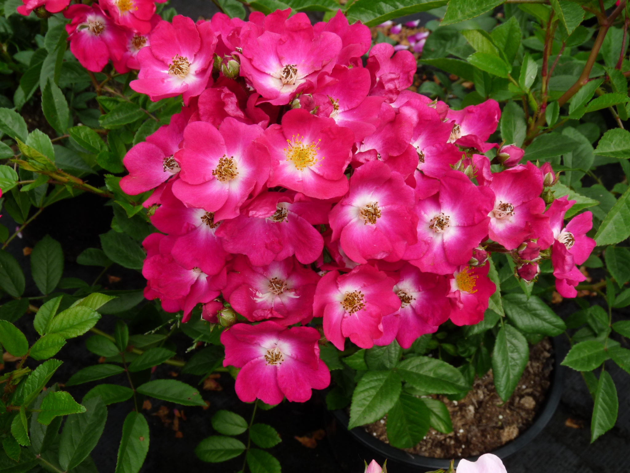 Троянда заслужено популярна у всьому світі. Квітки немахрові, малинові з білим центром, відтінюються яскраво-жовтими тичинками. Вони дрібні, але з'являються у великих кистях, зазвичай, по 20-60 шт. Висота куща до 150см. Безперервноквітуча.