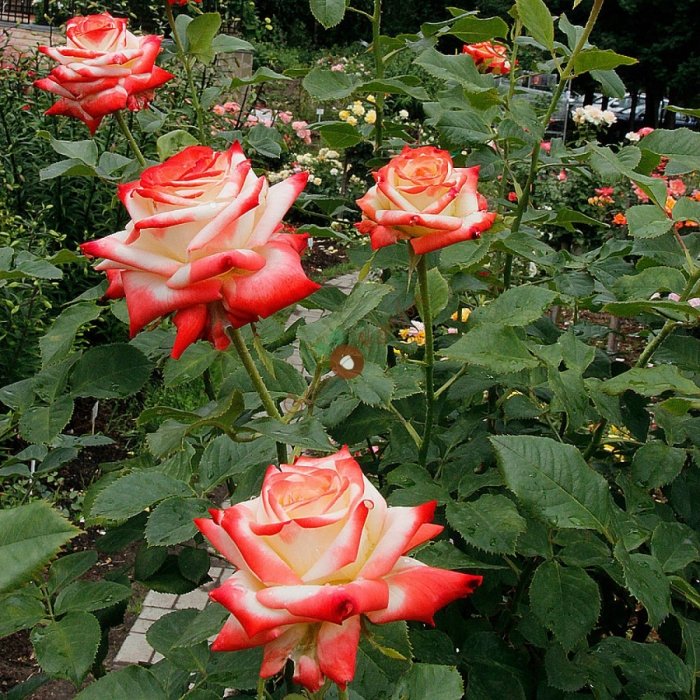 Листки троянди ясно-зеленого кольору, тому яскраво вираженого контрасту між пелюстками і листям немає. Кущ прямостоячий, що заввишки від 1,5 до 2 м, розширюється від низу до верху. Товщина, потужність і міра розвитку колючок залежать від порядку пагони. Троянда, як правило, має один бутон, але велика кількість пагонів забезпечує кущу пишний і квітучий вид. Сорт має наступні незаперечні переваги: він морозостійкий, невибагливий, толерантний до хвороб, чудово підходить для зрізання. А найголовніше - тривала тривалість цвітіння. Аромат слабо виражений, неяскравий, але має приємний фруктово-солодкий відтінок.