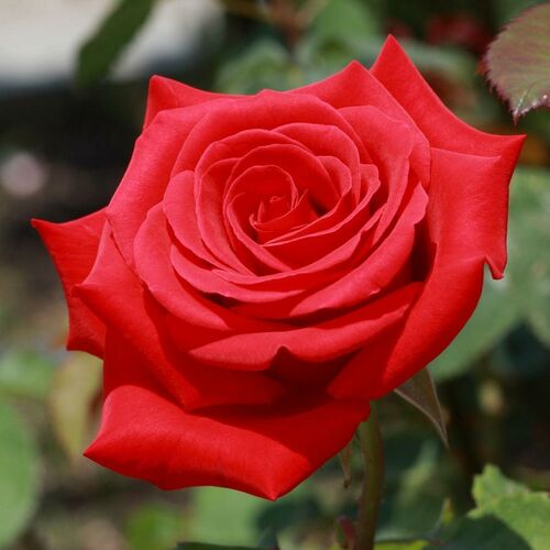 Цветки интенсивно ярко-красные, бархатные. Устойчивые к выгоранию. Зацветает раньше всех роз. Довольно известная срезочная, чайно-гибридная роза. Высота куста 150см.