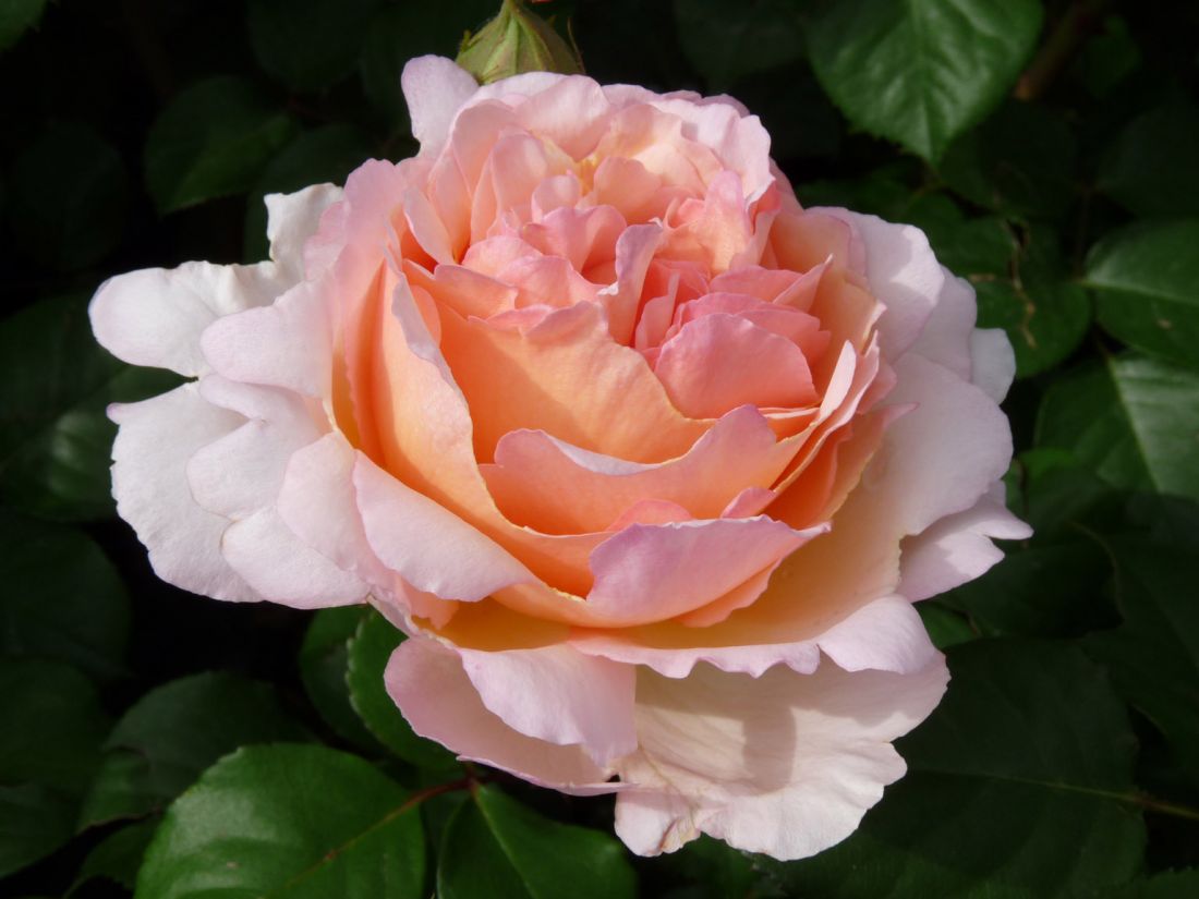 Великі квітки кремово-рожевого кольору зі світлішими крайніми пелюстками і рожевою облямівкою на середніх, з'являються з жовто-рожевих бутонів. У пелюсток красива зубчаста окантовка. Кущ вертикальний, листя темно-зелене, глянсове, хороша стійкість до захворювань і дощу.