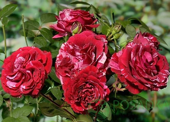 Дуже яскрава і приваблива, нещодавно створена троянда. Бутон щільний, загострений, келихоподібний, елегантний. Квіти 6-8см.в діаметрі, махрові (20- 25 пелюсток), приголомшливого забарвлення. Пелюстки темно червоні з рожевими нерівномірно розміщеними смужками і мазками. Цвіте активно і тривало. Квіти з'являються в невеликих кистях 3-5 штук і мають приємний аромат малини.