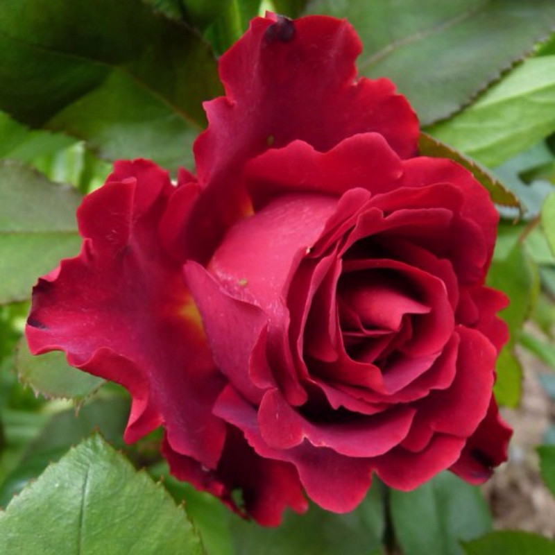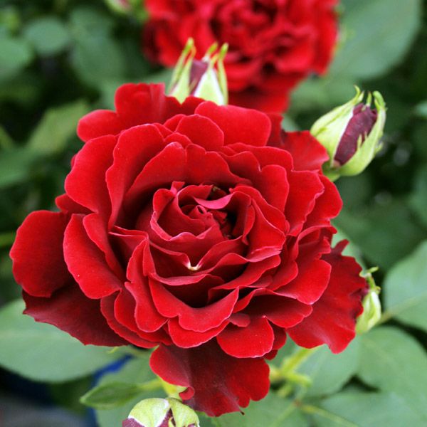 Цветки крупные, густомахровые, с бархатными лепестками насыщенного бордово-красного цвета, сохраняющегося на протяжении всего периода цветения. Они обладают приятным, тонким ароматом с фруктовыми и цветочными нотами. Бутоны раскрываются медленно, формируя классическую форму бокала, а затем роскошную розетку до 12 см в диаметре.
