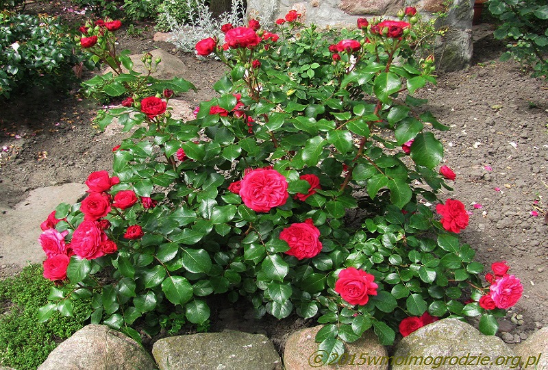 Цей сорт вражає насиченим темно-червоним кольором пелюсток, який не вицвітає навіть під палючим сонцем. Квітки густомахрові, діаметром 8–10 см, з високою декоративністю — нагадують старовинні троянди або квіти з картин епохи Відродження. Вони зібрані у великі суцвіття, рясно вкривають кущ упродовж усього сезону — з червня до перших заморозків. Аромат легкий, з приємними фруктовими нотками.