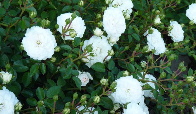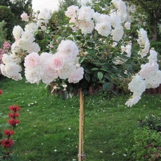 Троянда на штамбі заввишки 1.3м. з щепленнями грунтопокривної троянди Свані має густу плакучу крону. Цвітіння - щедре, безперервне. Аромат - ніжний, легкий, квітковий. Невеликі, густі, махрові квітки, діаметром п'ять - шість сантиметрів, розташовані на довгих стеблах, складаються приблизно з сорока пелюсток і збираються в зонтиковидні суцвіття по п'ять - двадцять штук.