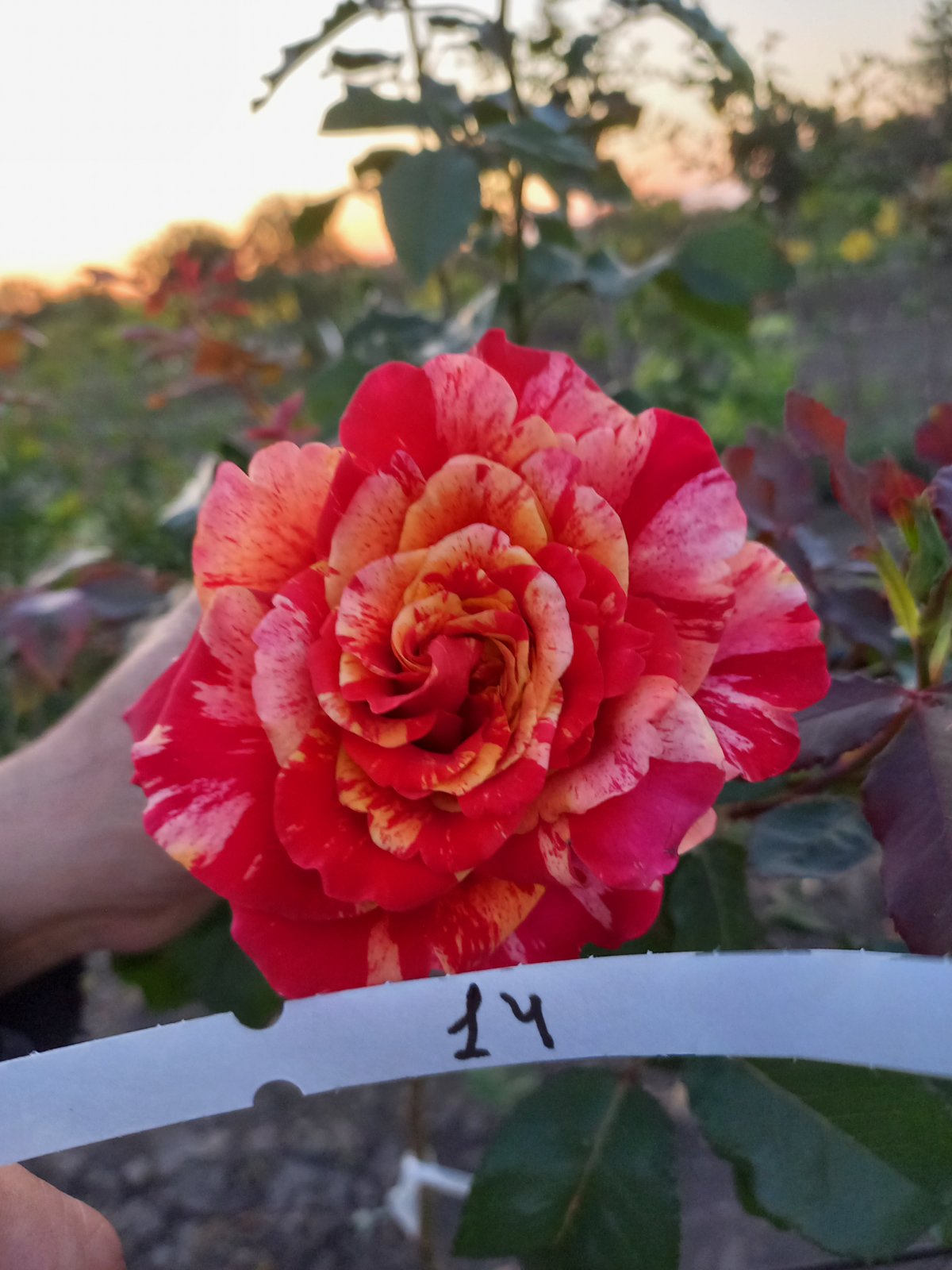 Квітка: Густомахрова, діаметром 7–9 см. Забарвлення складається з контрастних смуг темно-червоного, жовтого та білого кольорів.