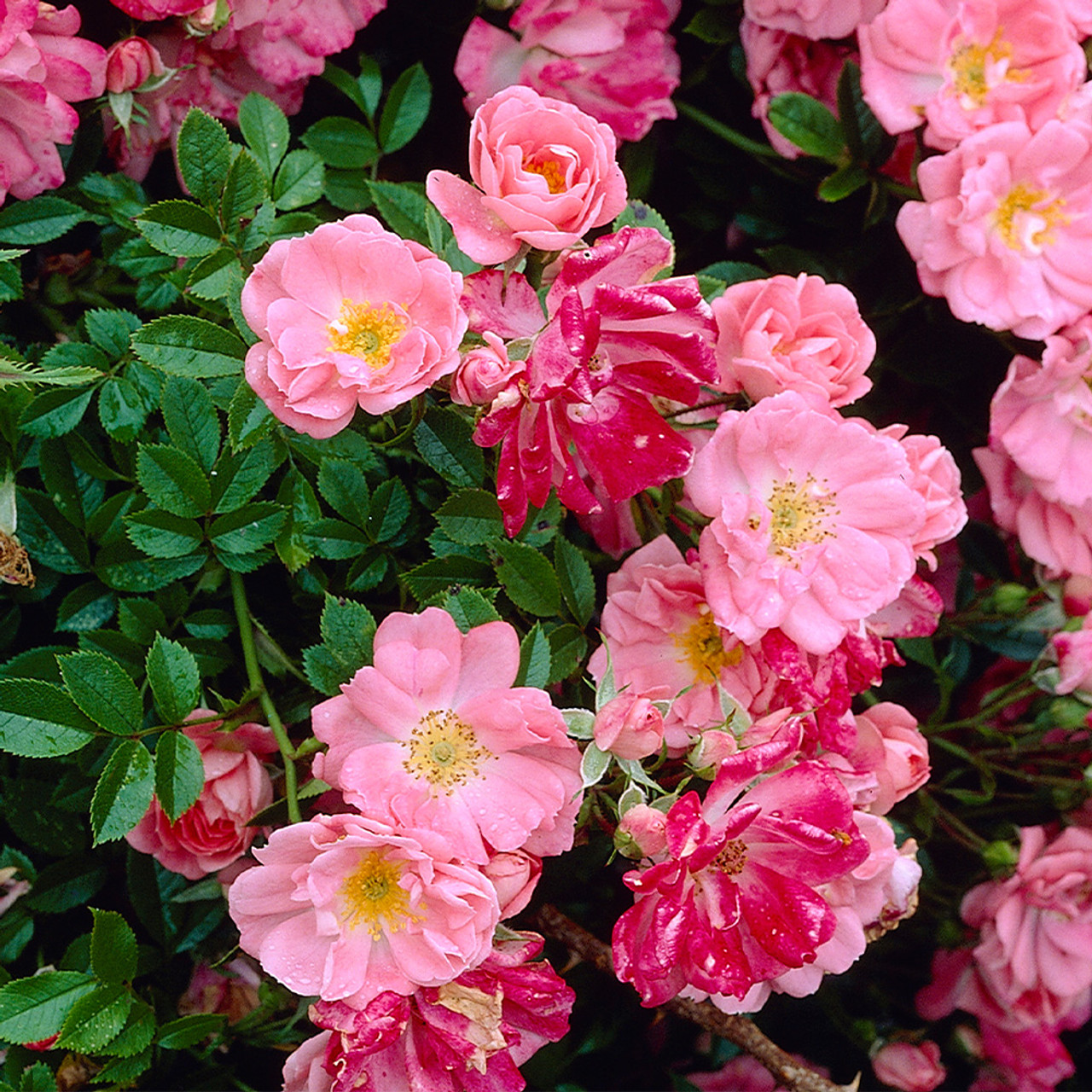 Квітки: напівмахрові, дрібні (3–4 см у діаметрі), яскраво-рожевого кольору з легким ароматом