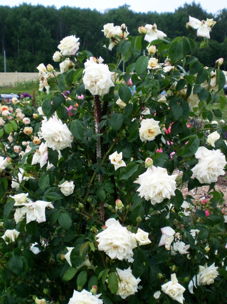 Квіти великі, махрові, чисто білі з рожевим відтінком в центрі. Місце розташування півтінь. Період цвітіння двічі за сезон, на початку літа і пізніше в осені. Кущ сильнорослий, досягає 3 м., акуратний, прямостоячий, легко спрямовується по опорі. Листя блискучі, яскраво-зелені.
