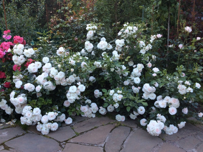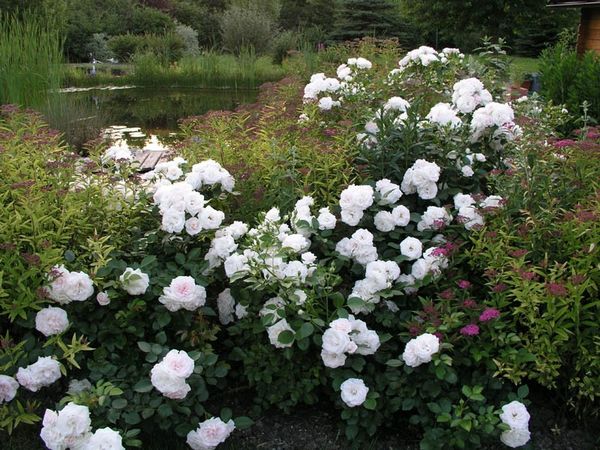 Густий кущ з сильними пагонами, заввишки 60-70см., усипаний дрібним зеленим глянсовим листям. Білосніжні махрові квітки, діаметром до 8см., чашовидної форми зібрані в кисті по 10-15 штук і мають слабкий аромат, а в холодну погоду придбавають рожевуватий відтінок в центрі. Рясно і практично безперервно цвітуть до пізньої осені і прекрасно переносять зими під легким укриттям. Чудово виглядає як в невеликих квітниках, так і масових або бордюрних посадках. При попаданні дощу на пелюстки, не втрачає свій привабливий зовнішній вигляд. Сорт відрізняється високою стійкістю до хвороб, не рахуючи деякої схильності іржі в зараженій місцевості. Також володіє хорошою самовідчищенням при відцвітанні. Щільність посадки - приблизно 5шт/1 м2.