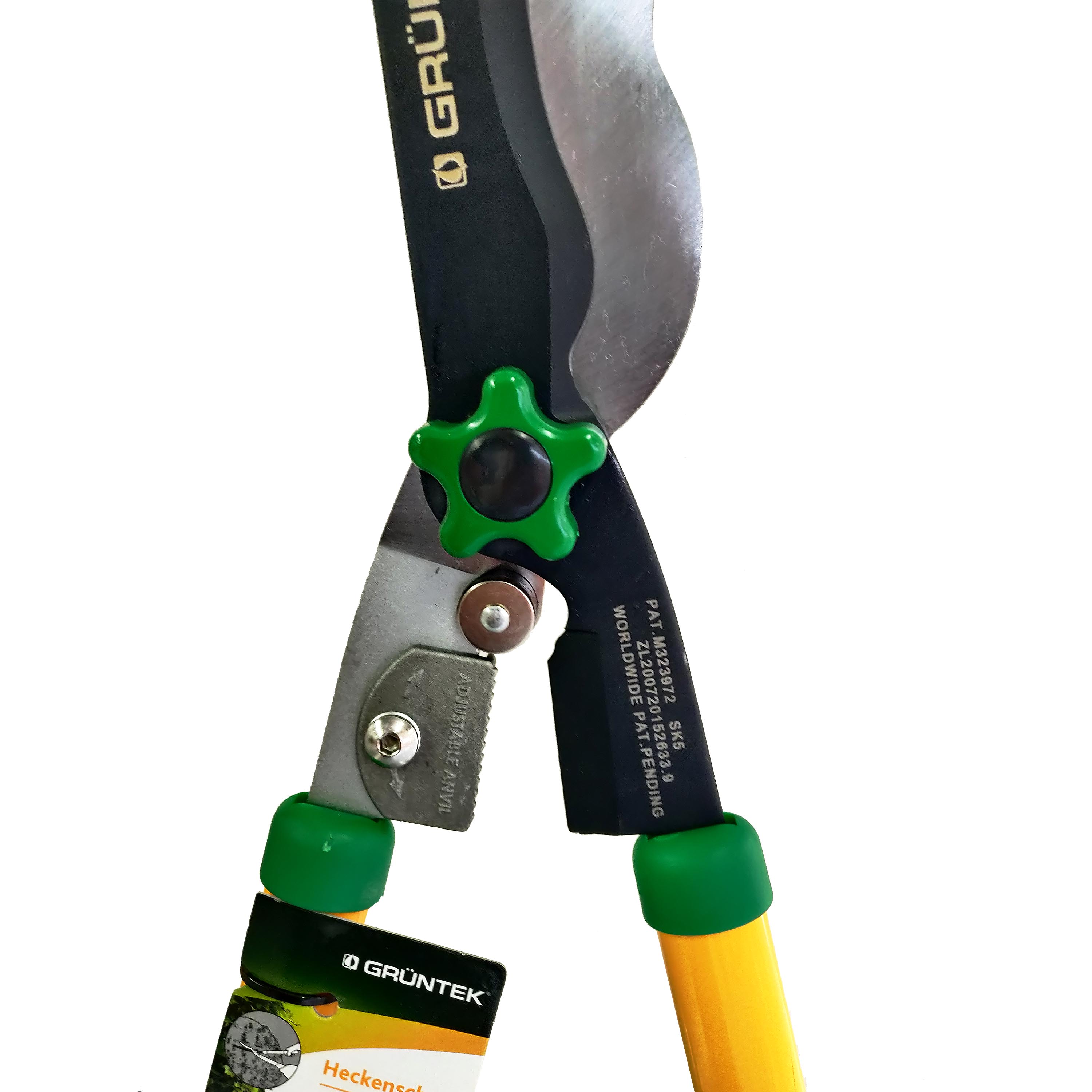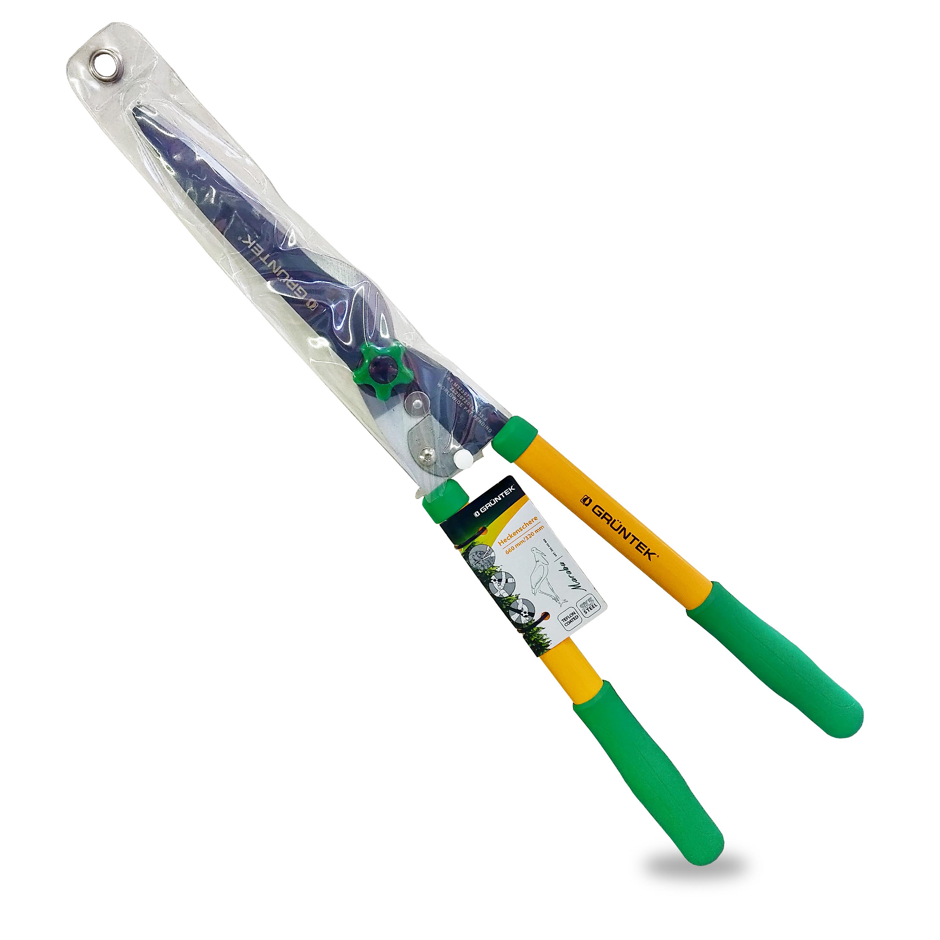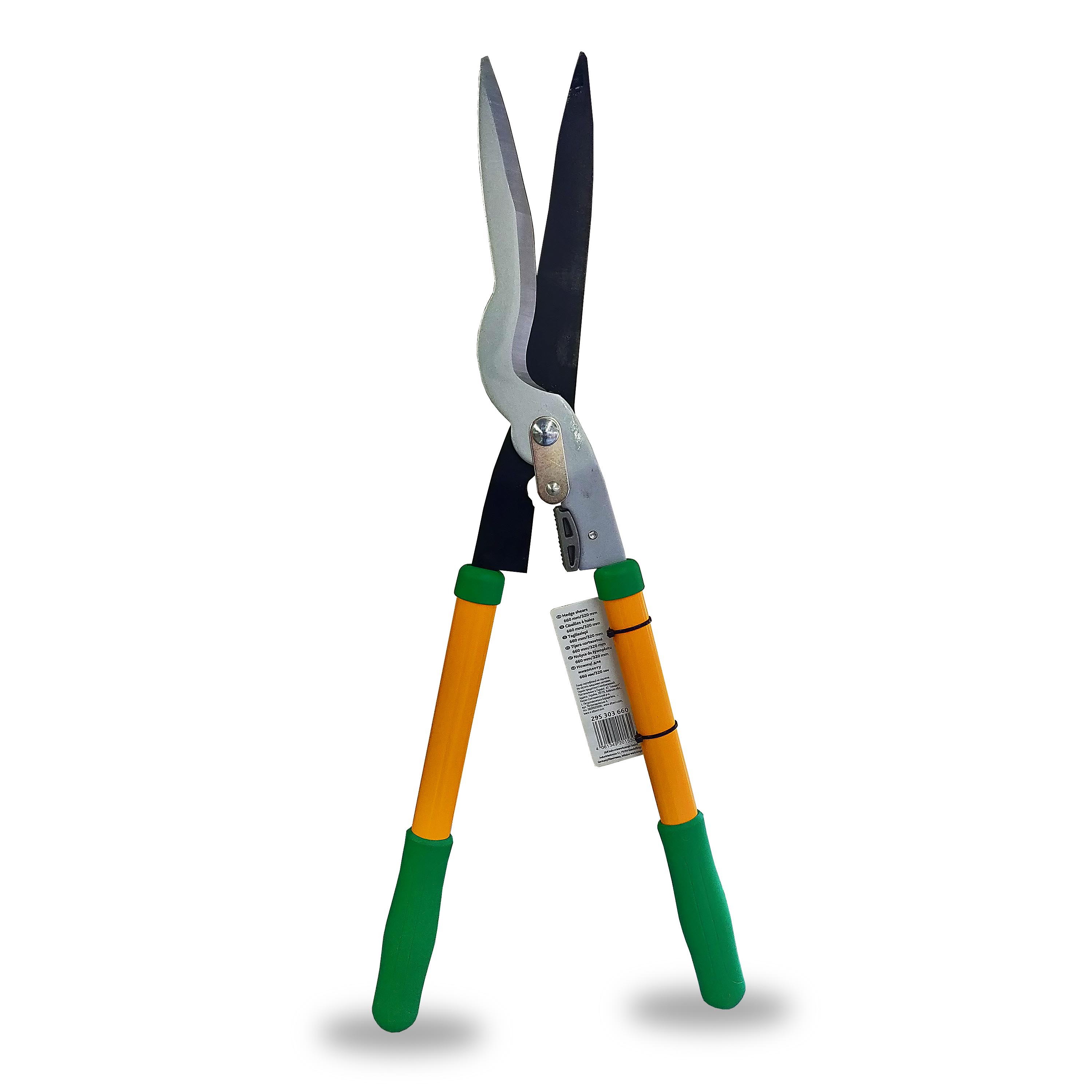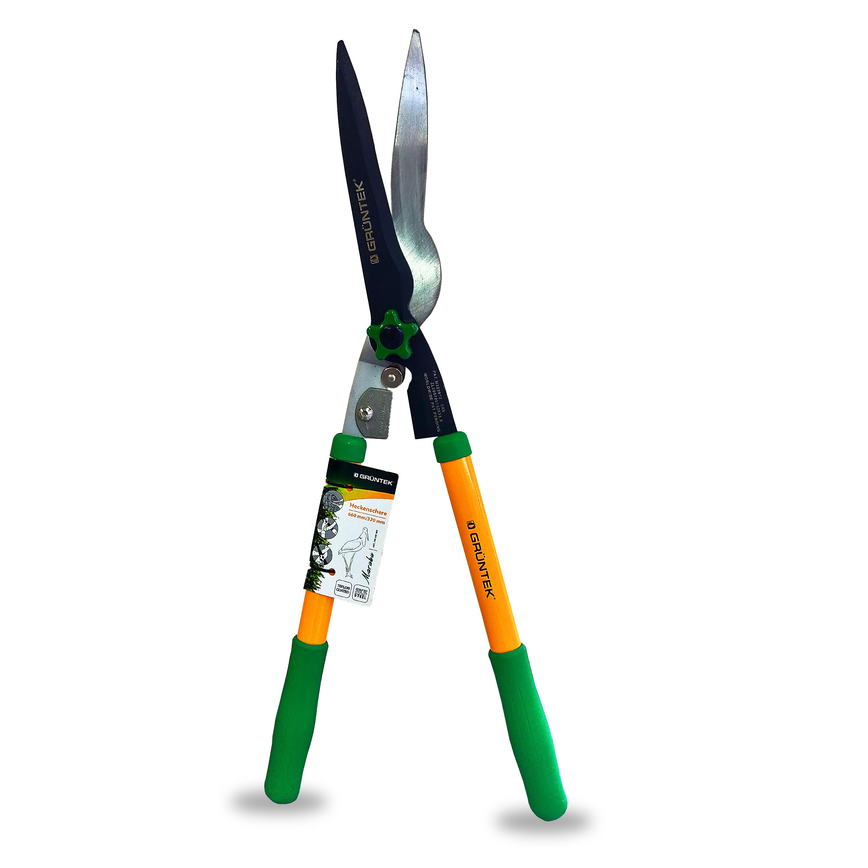 Довжина леза 320мм Рекомендовано для стрижки живої огорожі та обрізки живих гілок З функцією гілкоріза Леза хвилясті із загартованої високовуглецевої сталі SK5 Покриття TEFLON на лезі проти налипання Гвинт для регулювання зусиль та затискання лез Сталеві рукоятки з пластиковими накладками Довжина ножиць - 600мм